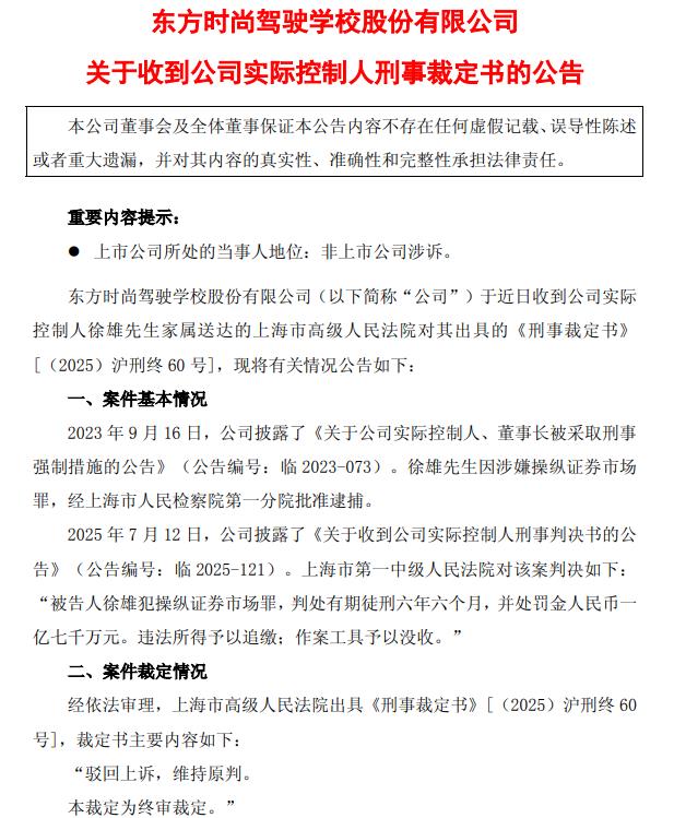 1 月 23 日,ST 东时(603377.SH) 公告称,公司近日收到实际控制人徐雄家属送达的上海市高级人民法院出具的 《刑事裁定书》,「驳回上诉,维持原判。本裁定为终审裁定。」。2025 年 7 月 12 日,公司披露 《关于收到公司实际控制人刑事判决书的公告》。上海市第一中级人民法院对该案判决如下:「被告人徐雄犯操纵证券市场罪,判处有期徒刑六年六个月,并处罚金人民币一亿七千万元。违法所得予以追缴;作案工具予以没收。」 公司实际控制人徐雄已不在公司担任董事及高级管理人员职务,上述判决系徐雄个人行为,不会影响徐雄股东权利的行使及公司的正常业务运作。