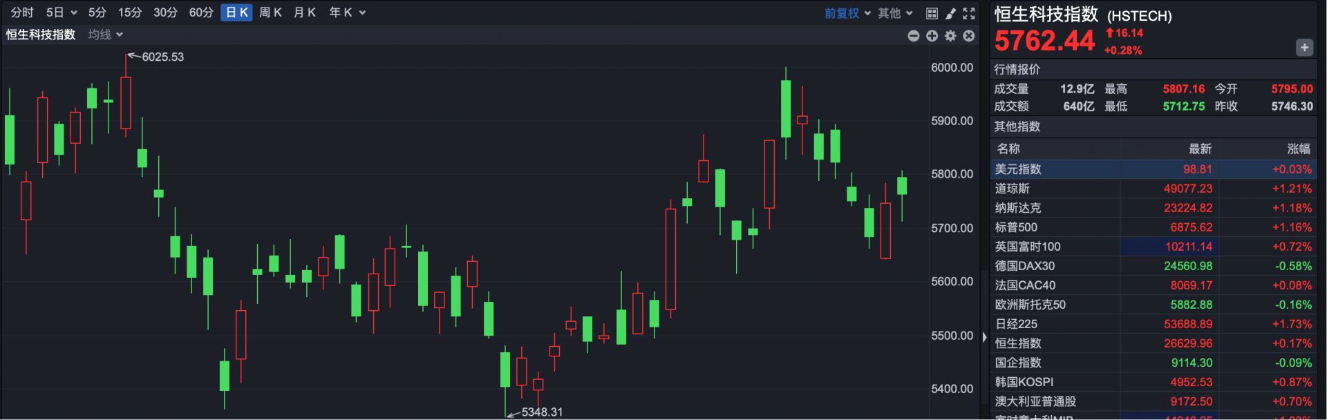恒生科技指数报收 5762.44 点,上涨 16.14 点,涨幅 0.28%。