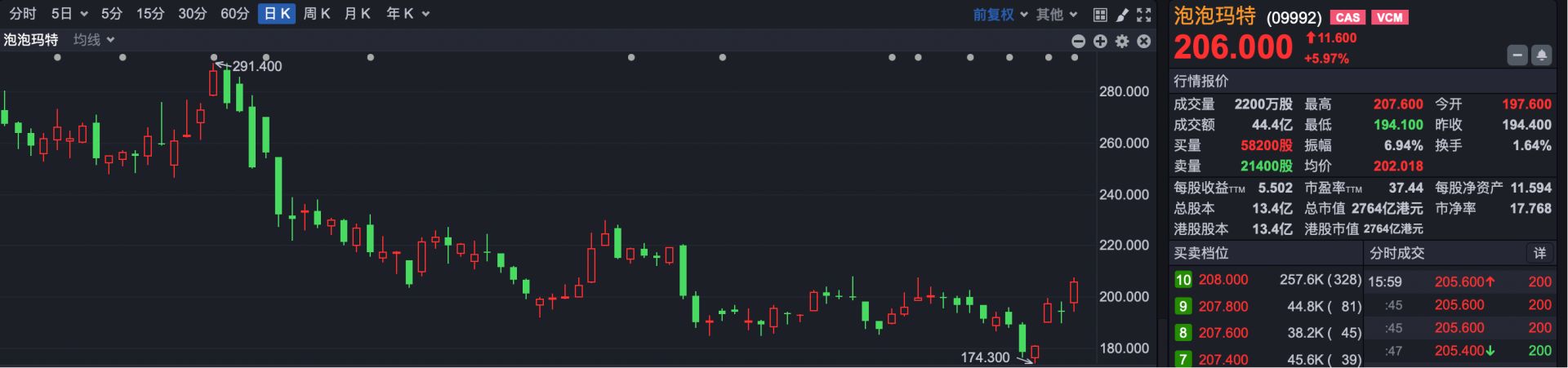泡泡玛特 (HK09992) 再涨近 6%,股价重回 200 港元上方。