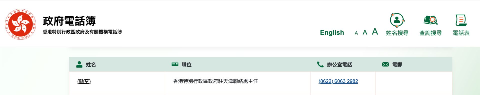 1 月 22 日,《每日经济新闻》 记者 (以下简称 「每经记者」) 查询发现,在香港特区政府电话簿中,香港特区政府驻天津联络处主任一职已显示为 「悬空」。