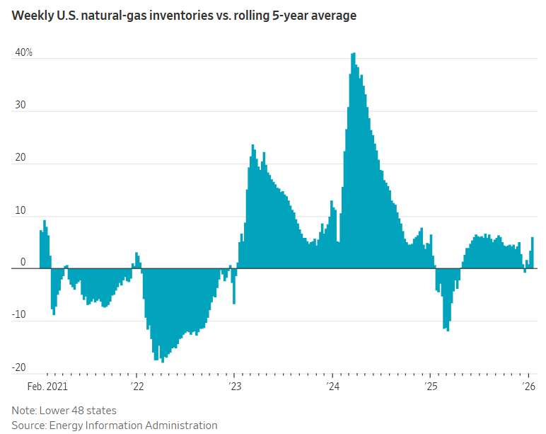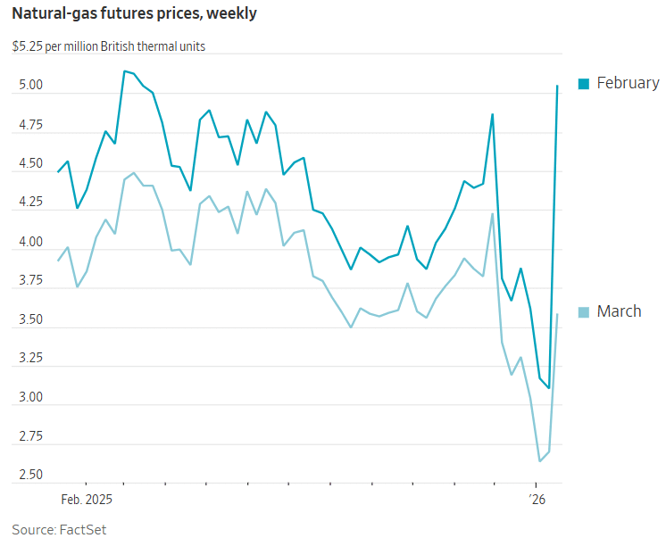 天然气价格涨幅最大的是近期交付的合约。作为取暖和发电燃料的二月交割期货合约,录得了有记录以来最大的三日百分比涨幅。周四,该期货结算价为每百万英热单位 5.045 美元,远高于上周五的 3.103 美元。