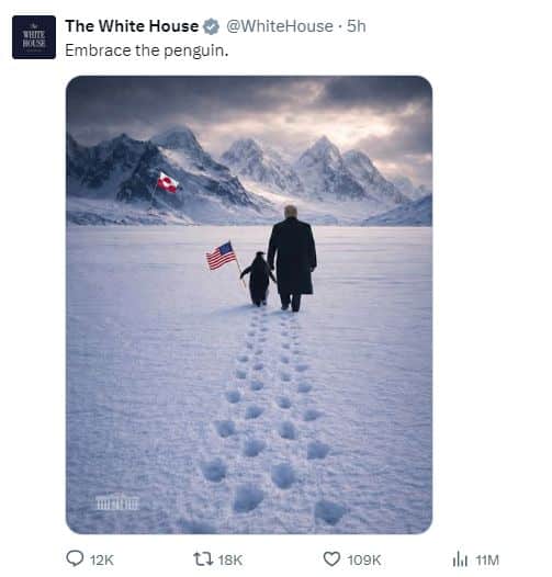 据央视新闻,当地时间 1 月 23 日,美国白宫在社交媒体发布了一张 AI 图片。图片中美国总统特朗普和手持美国国旗的企鹅行走在冰天雪地中,他们的前方插着丹麦自治领地格陵兰岛旗,并配文 「拥抱企鹅」。