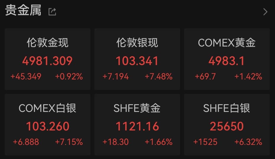 受地缘局势持续升温影响,贵金属上演史诗级大涨。周五 (1 月 23 日) 纽约交易时段,现货黄金一度涨至 4990 美元,创历史新高,本周金价累涨超 8%;现货白银单日大涨超 7%,最高报约 103 美元/盎司,再创历史新高纪录,本月迄今已暴涨超 40%。以期货即月合约收盘价计,金银齐创 2020 年来最大单周涨幅。
