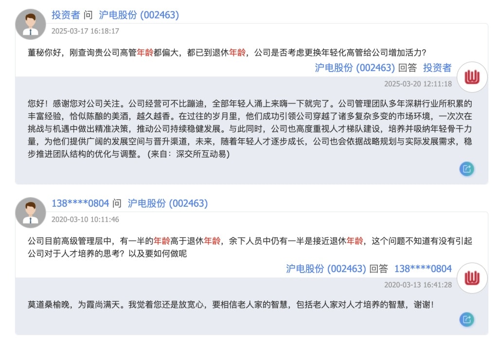 2025 年 3 月,面对 「公司高管年龄都偏大,都已到退休年龄,是否考虑更换年轻化高管」 的提问,该公司更是连续幽默回应 「公司经营可不比蹦迪,全部年轻人涌上来嗨一下就完了。公司管理团队多年深耕行业所积累的丰富经验,恰似陈酿的美酒,越久越香。」 另一次则回复道:「莫道桑榆晚,为霞尚满天。我觉着您还是放宽心,要相信老人家的智慧,包括老人家对人才培养的智慧。」