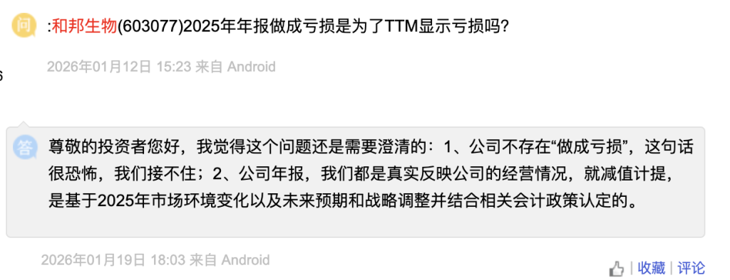 四川和邦生物科技股份有限公司 (和邦生物,603077.SH) 就遇到了这样的问题。有投资者提及 「2025 年年报做成亏损是为了 TTM 显示亏损吗?」 对此,和邦生物董秘于今年 1 月 19 日在上证 e 互动上回复,公司不存在 「做成亏损」,这句话很恐怖,我们接不住。公司年报都是真实反映公司的经营情况,就减值计提,是基于 2025 年市场环境变化以及未来预期和战略调整并结合相关会计政策认定的。