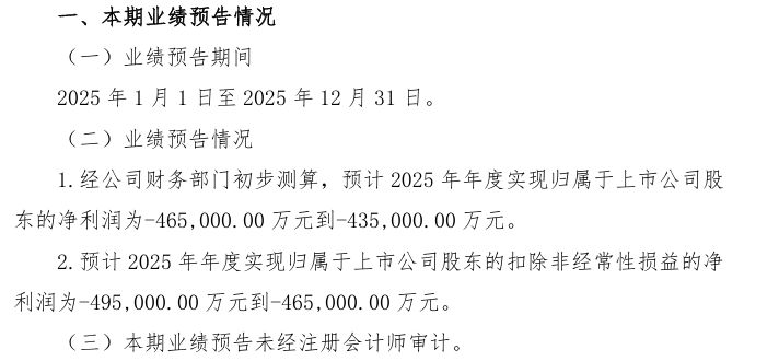 公司近日发布的 2025 年业绩预告显示,2025 年全年归属于上市公司股东的净利润预计亏损 43.5 亿元至 46.5 亿元,较 2024 年的 69.5 亿元亏损额收窄 33% 至 37%。扣非后净亏损 46.5 亿至 49.5 亿元,亏损额同比收窄 32% 至 36%。