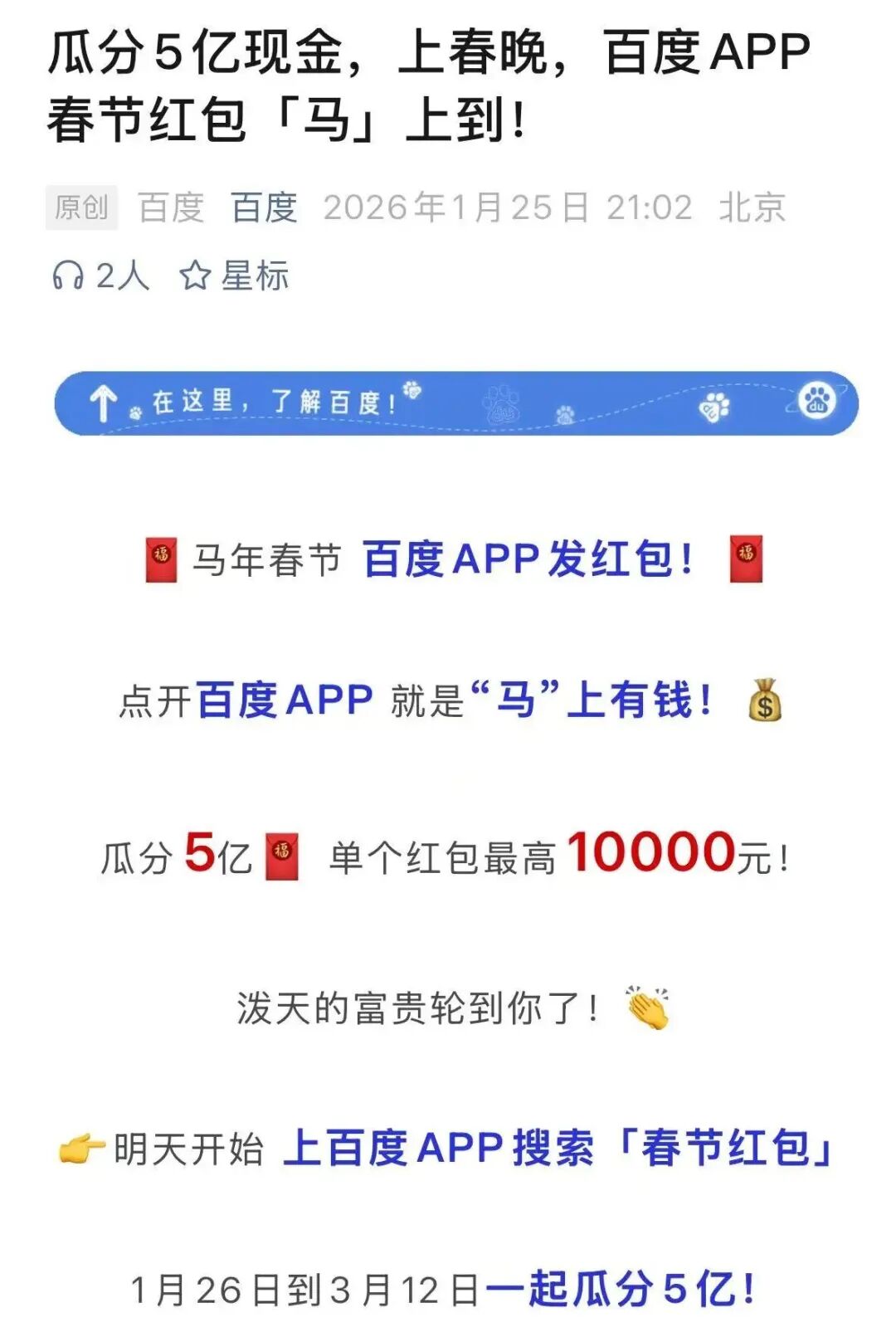 值得注意的是,1 月 25 日晚,百度宣布,自 1 月 26 日至 3 月 12 日,用户在百度 APP 搜索 「春节红包」,就有机会瓜分 5 亿元红包,单个红包最高 1 万元。此外,百度特别提示,红包任务已融入文心助手的近百种春节创意玩法之中。活动期间,只要使用文心助手,就能获得上述红包。