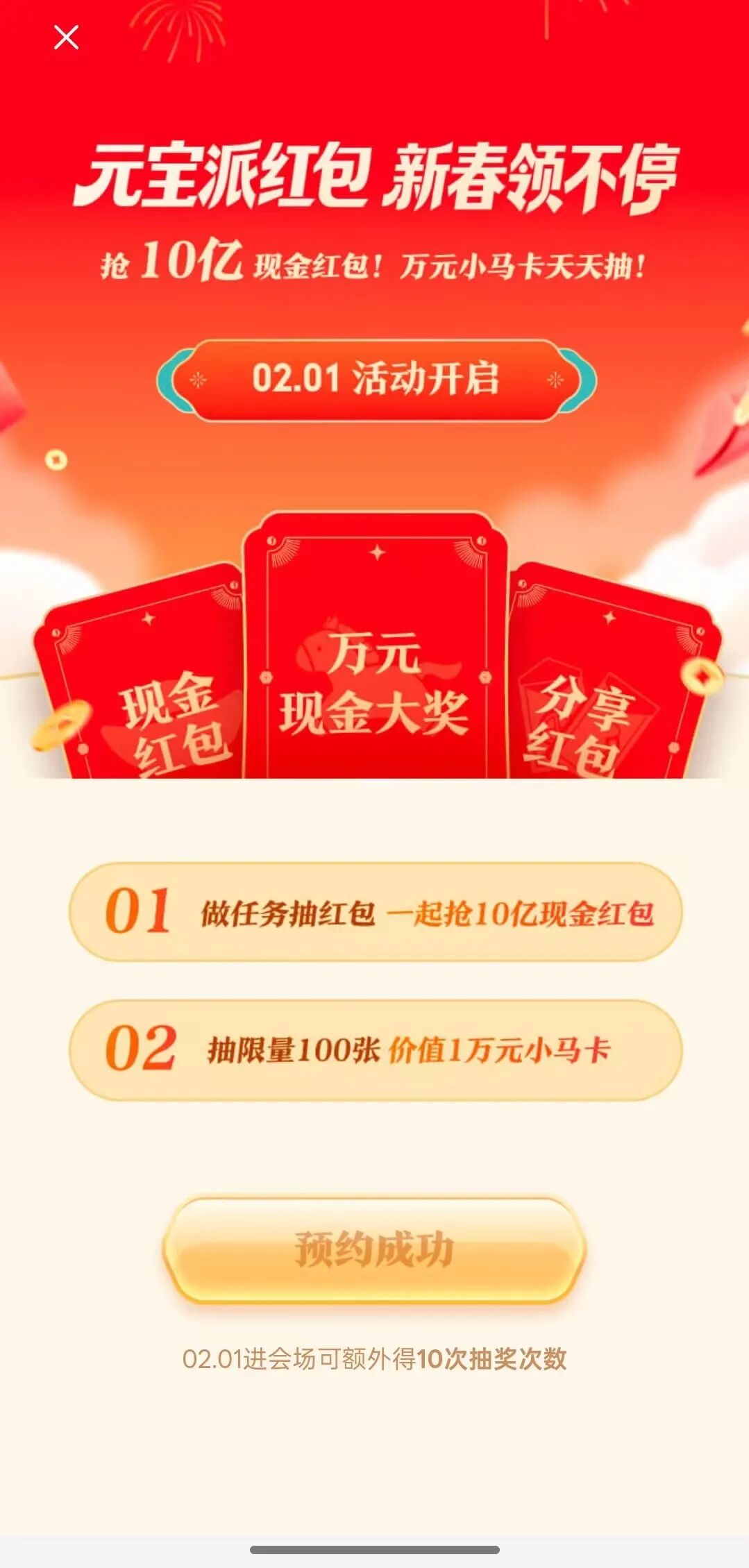 据介绍,用户可于 1 月 25 日将元宝 App 更新到 2.55.0 以上版本,点击主页的预约卡片即可进入春节会场预约页面,提前预约的用户将在 2 月 1 日活动开启当天,额外获得 10 次抽奖次数。