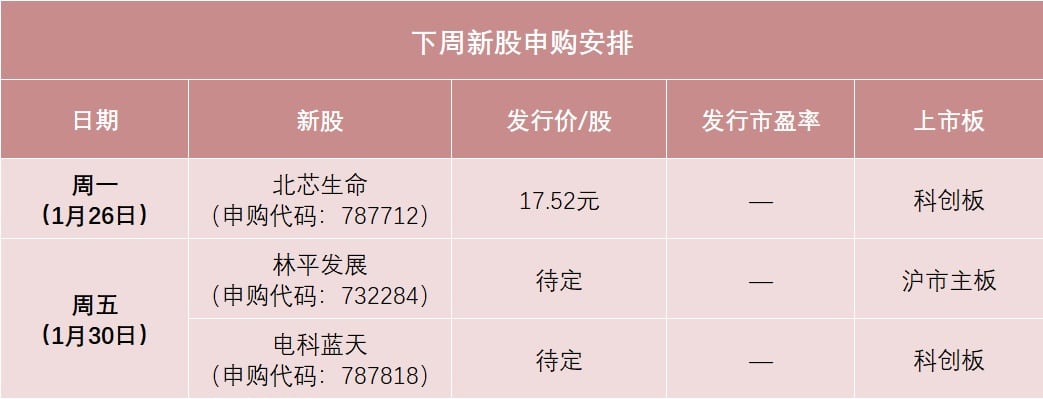 日程安排上,科创板新股北芯生命将在周一 (1 月 26 日) 申购,沪市主板新股林平发展、科创板新股电科蓝天将在周五 (1 月 30 日) 申购。