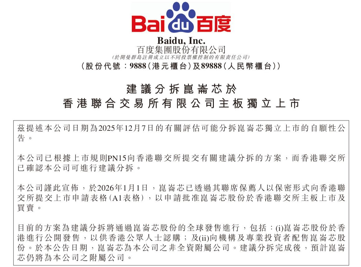 1 月 2 日,百度集团 (09888.HK) 发布公告,宣布其非全资附属公司昆仑芯 (北京) 科技股份有限公司已于 2026 年 1 月 1 日通过联席保荐人以保密形式向香港联合交易所提交上市申请表格,申请在港交所主板独立上市及买卖。