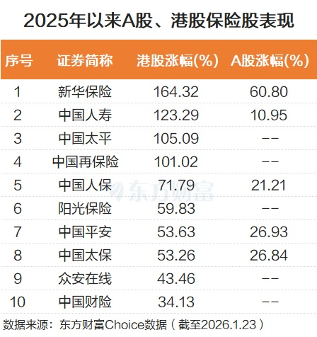 2025 年以来,保险股整体强势,尤其多只在香港上市的保险股,已是翻倍。比如港股的新华保险,2025 年以来大涨 164.32%。港股的中国人寿,2025 年以来大涨 123.29%。港股的中国太平和中国再保险也是翻倍。