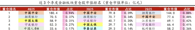 从 2025Q2-2025Q4 的三个季度来看,公募基金对金融股的持股来看,前五大重仓股中,保险股越来越多,2025Q2 只有中国平安,Q3 有中国平安和中国太保,Q4 有中国平安、中国太保和中国人寿。