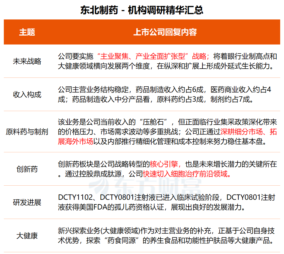 「公司未来增长的核心动力在于创新研发成果的落地转化。」 东北制药表示,如果核心细胞治疗产品临床试验顺利并最终成功上市,将打开公司的成长空间。同时,原料药业务的国际化布局和全公司的数字化管理增效也是重要的积极因素。