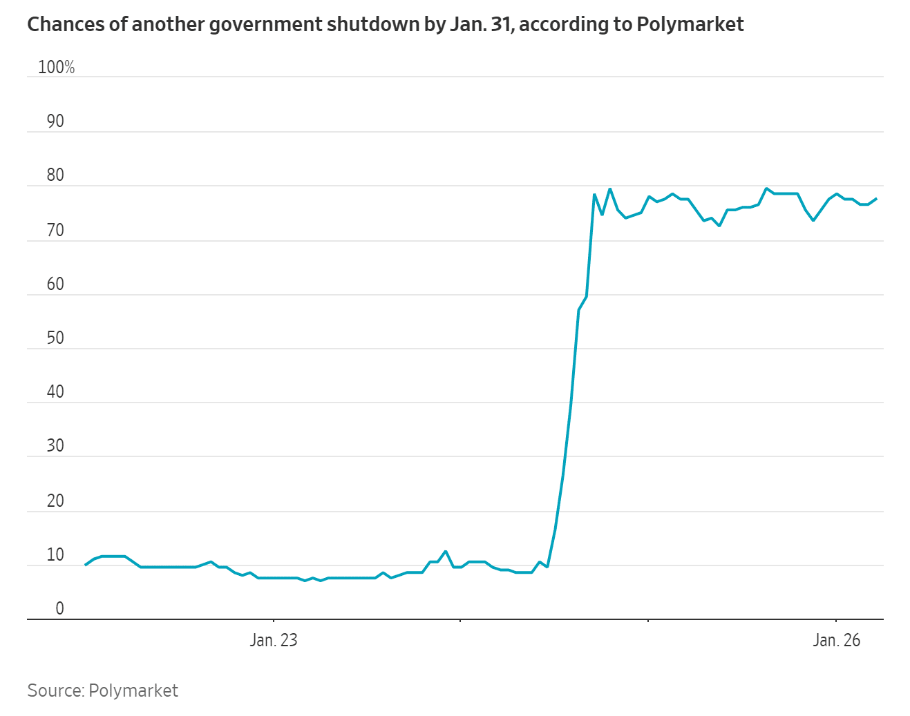 Polymarket 的数据显示,截至周一,市场定价所隐含的一月底政府停摆概率已飙升至 78%,而在上周五,这一数字还不足 10%。目前,围绕该事件的博弈已吸引了约 750 万美元的交易量。