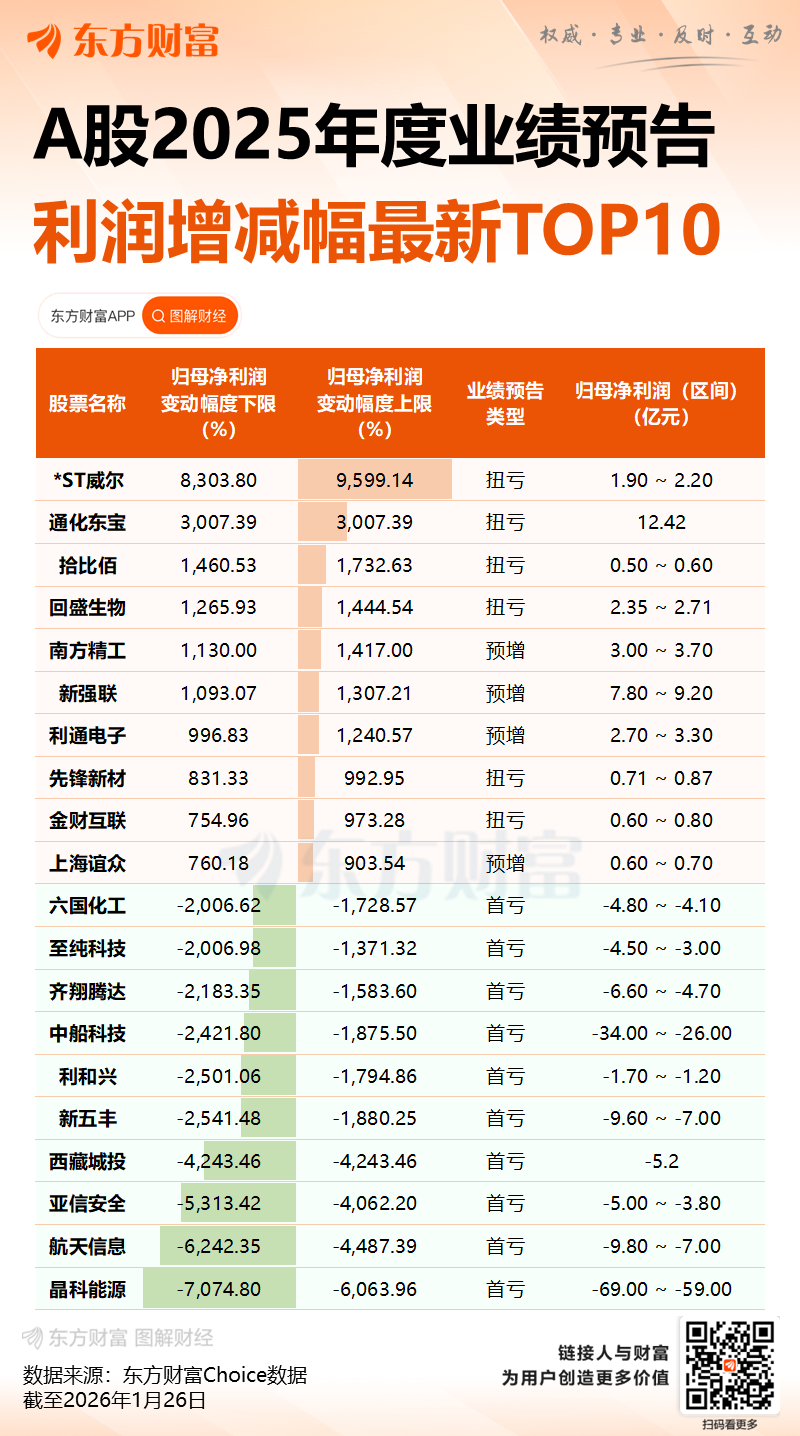 据证券时报·数据宝统计,1 月 26 日盘后,A 股市场 141 家上市公司发布 2025 年业绩预告,3 家上市公司发布 2025 年业绩快报,共计 144 家企业。以快报或预告中值统计,24 股净利润逾 3 亿元。其中,中航成飞、三生国健、九安医疗净利润在 20 亿元以上;均胜电子、通化东宝、恒生电子、上海建工、瑞芯微净利润逾 10 亿元。