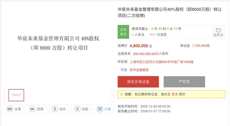 还值得关注的是,华宸未来基金此前已出现股权处置动作。记者在全国产权交易中心官网上看到,华宸未来基金 40% 股权 (即 8000 万股) 转让项目已经在二次挂牌,报名时间从 2025 年 12 月 30 日至 2026 年 1 月 27 日。