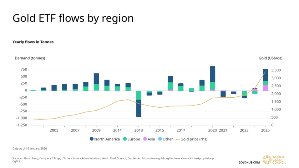 世界黄金协会数据显示,2025 年黄金 ETF 迎来创纪录资金流入,其中北美基金表现领跑,全年资金流入额飙升至 890 亿美元;按吨位计算,流入规模达 801 吨,创下 2020 年以来的最高纪录。
