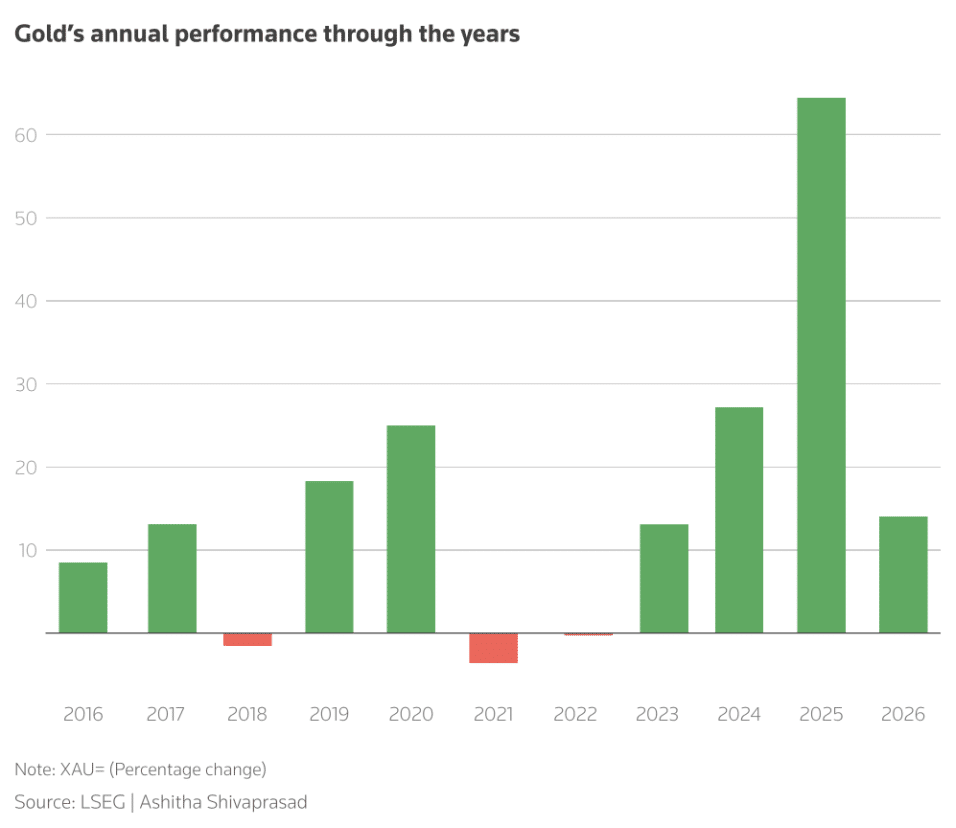 受地缘政治与经济风险冲击市场影响,黄金价格一度冲高至 5110 美元以上。这一避险资产在 2025 年大涨 64% 后,今年涨幅已超 17%。
