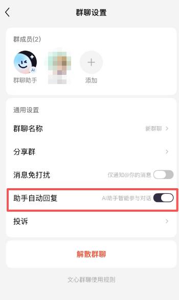 可对群聊进行设置,如 AI 智能助手是否能够进行自动群聊回复等。