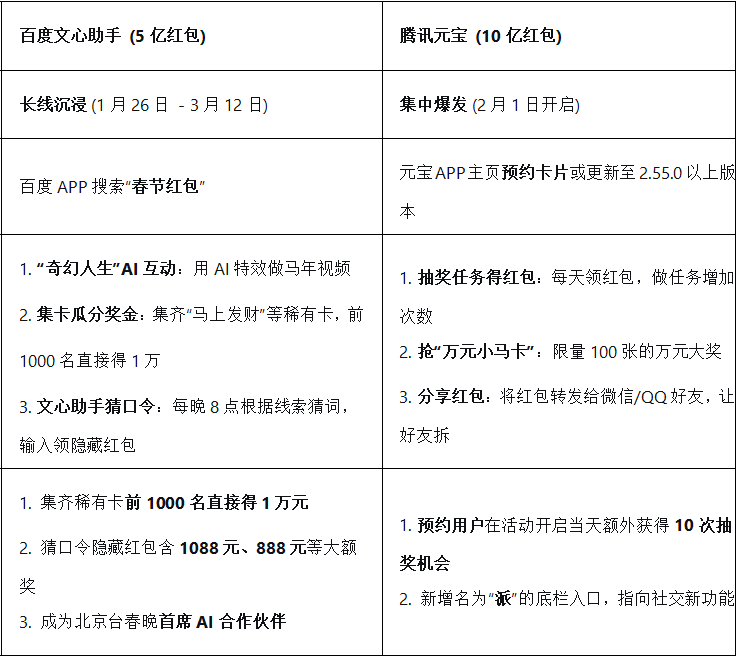 下表整理了百度文心助手、腾讯元宝抢红包的具体操作和细节,供大家参考: