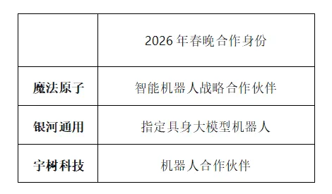 至此,已经有三家机器人宣布与 2026 年央视春晚达成合作。宇树、银河通用和魔法原子三家机器人公司即将同台竞技。