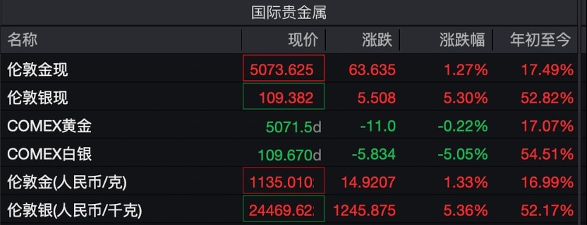 21 世纪经济报道记者注意到,在不到一个月的时间里,伦敦现货白银与 COMEX 白银期货年内累计涨幅均已超过 50%。若将时间拉长至 2025 年起算,两者当年累计涨幅更是双双突破 110%,表现显著超越同期国际金价。