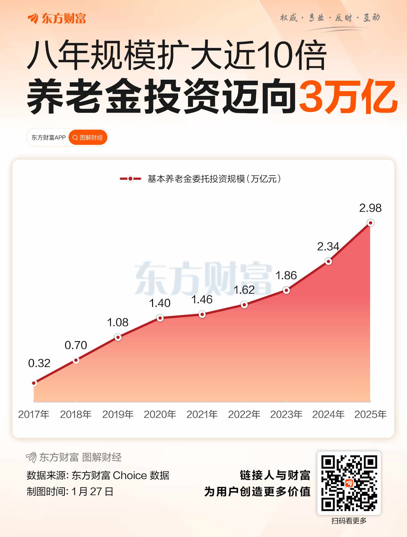 人社部最新数据显示,截至 2025 年底,我国基本养老保险基金委托投资规模 (下称养老金投资规模) 超过 2.98 万亿元。而 2017 年末这一规模仅 0.32 万亿元,八年间规模扩大至近 10 倍。