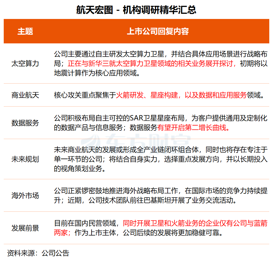 航天宏图在调研中特别提到,公司受到了当地政府的高度重视,同时,目前在国内民营领域,同时开展卫星和火箭业务的企业仅有公司与蓝箭两家。作为上市主体,公司后续的发展将更加稳健可靠。