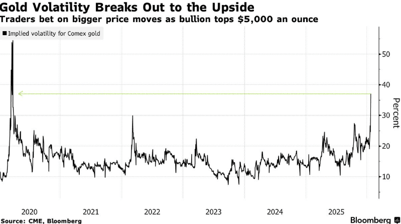 纽约商品交易所 (Comex) 黄金期货的隐含波动率已跃升至 2020 年 3 月疫情高峰期以来的最高水平。同时,全球最大黄金交易所交易基金——SPDR Gold Shares(GLD) 的波动率也突破前期高点,交易员正押注金价将出现大幅上涨。