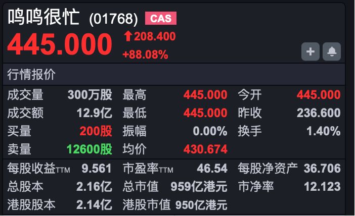 新股方面,鸣鸣很忙 (HK01768) 上市首日高开超 88%,股价报 445 港元,总市值达 959 亿港元。