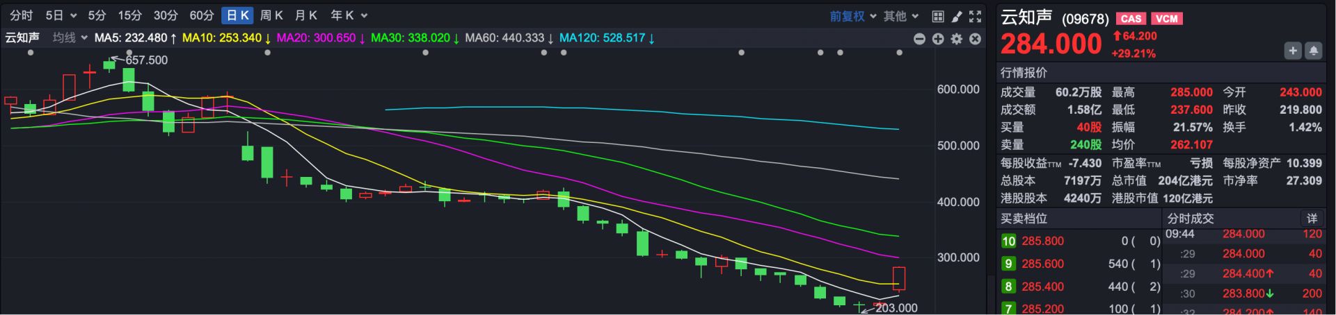 市场焦点方面,云知声 (HK09678) 高开后股价快速拉升,截至发稿,最大涨幅超过 29%。