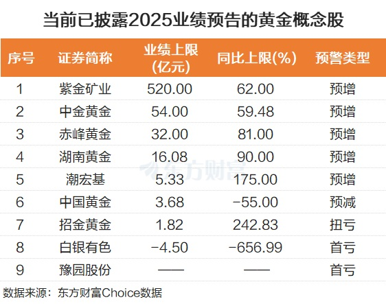 黄金概念的走强,受到当前披露的业绩预告提振。东方财富Choice 数据显示,目前已有 9 股黄金概念股披露 2025 年业绩预告,其中 5 股业绩预增,1 股业绩扭亏。