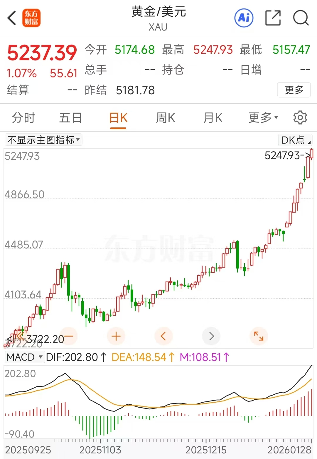 近来,国际金价也涨势惊人。1 月 28 日,现货黄金盘中一度突破 5200 美元,最高逼近 5250 美元。而 2025 年最后一个交易日,现货黄金报收 4310.89 美元。也就是说,2026 年开年不到一个月时间,现货黄金已大涨超过 900 美元。