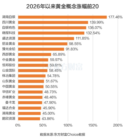 2026 年以来,黄金概念加速上行,截至 1 月 28 日早盘结束,湖南白银、四川黄金、白银有色、晓程科技、盛达资源股价翻倍。湖南白银以 177.46% 领涨。