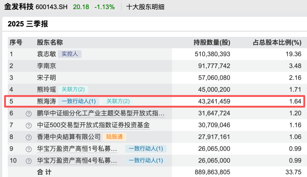 此外,熊海涛还是金发科技(600143) 的第五大股东。进一步来看,金发科技实际控制人袁志敏与熊海涛曾有一段婚姻,该上市公司 2015 年年报披露,袁志敏与熊海涛系夫妻关系,但到了 2016 年半年报已不再显示双方有这层关系。近年来,袁志敏与熊海涛曾多次入围 《胡润百富榜》,2024 年 10 月,两人以 410 亿元财富位列 《2024 年·胡润百富榜》 第 125 位。