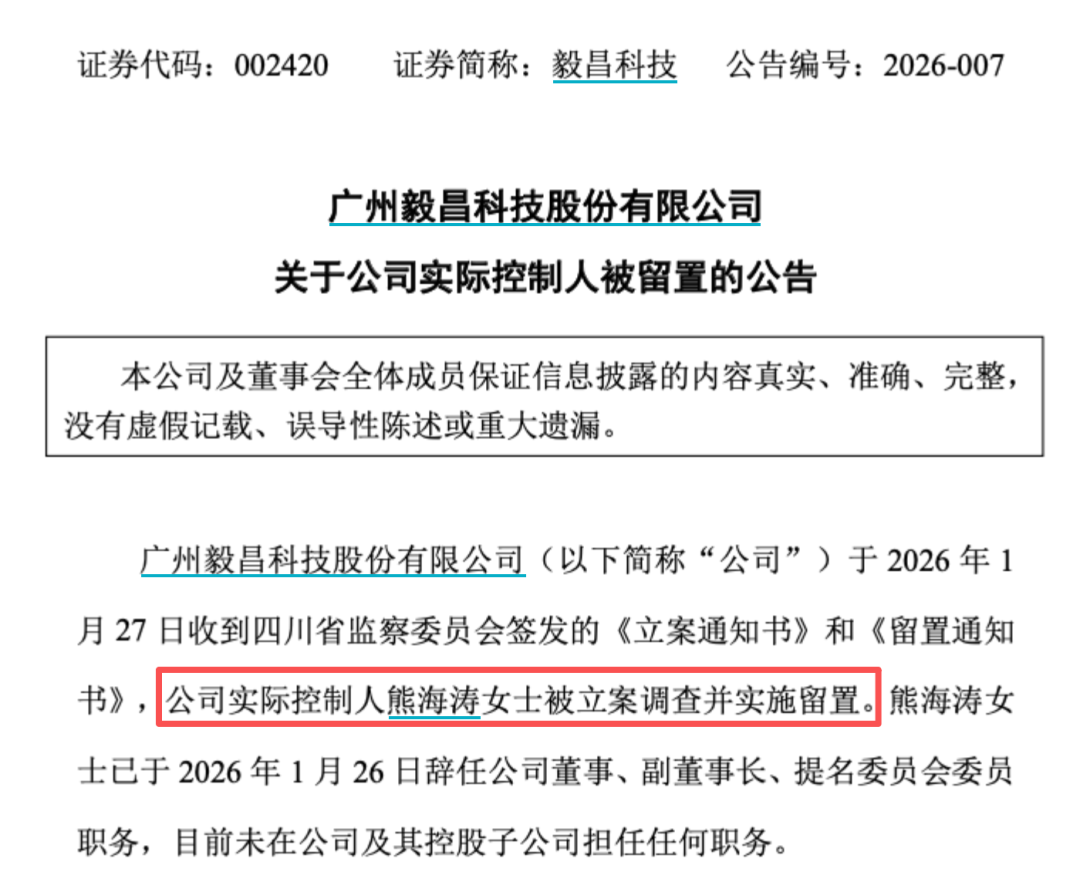 1 月 27 日晚间,毅昌科技和高盟新材也双双发布公告称,实际控制人熊海涛因涉嫌犯罪,被四川省监察委员会立案调查并实施留置。不过,熊海涛已于 1 月 26 日辞去毅昌科技董事、副董事长、提名委员会委员职务,目前未在该上市公司及其控股子公司担任任何职务。