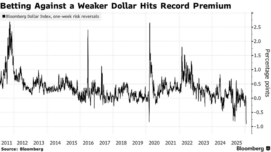 从美元走弱中获利的短期期权溢价已扩大至彭博社自 2011 年开始编制该数据以来的最高水平,且看空情绪并非仅集中在短期市场——投资者对美元长期前景的悲观程度,至少创下 2025 年 5 月以来之最。