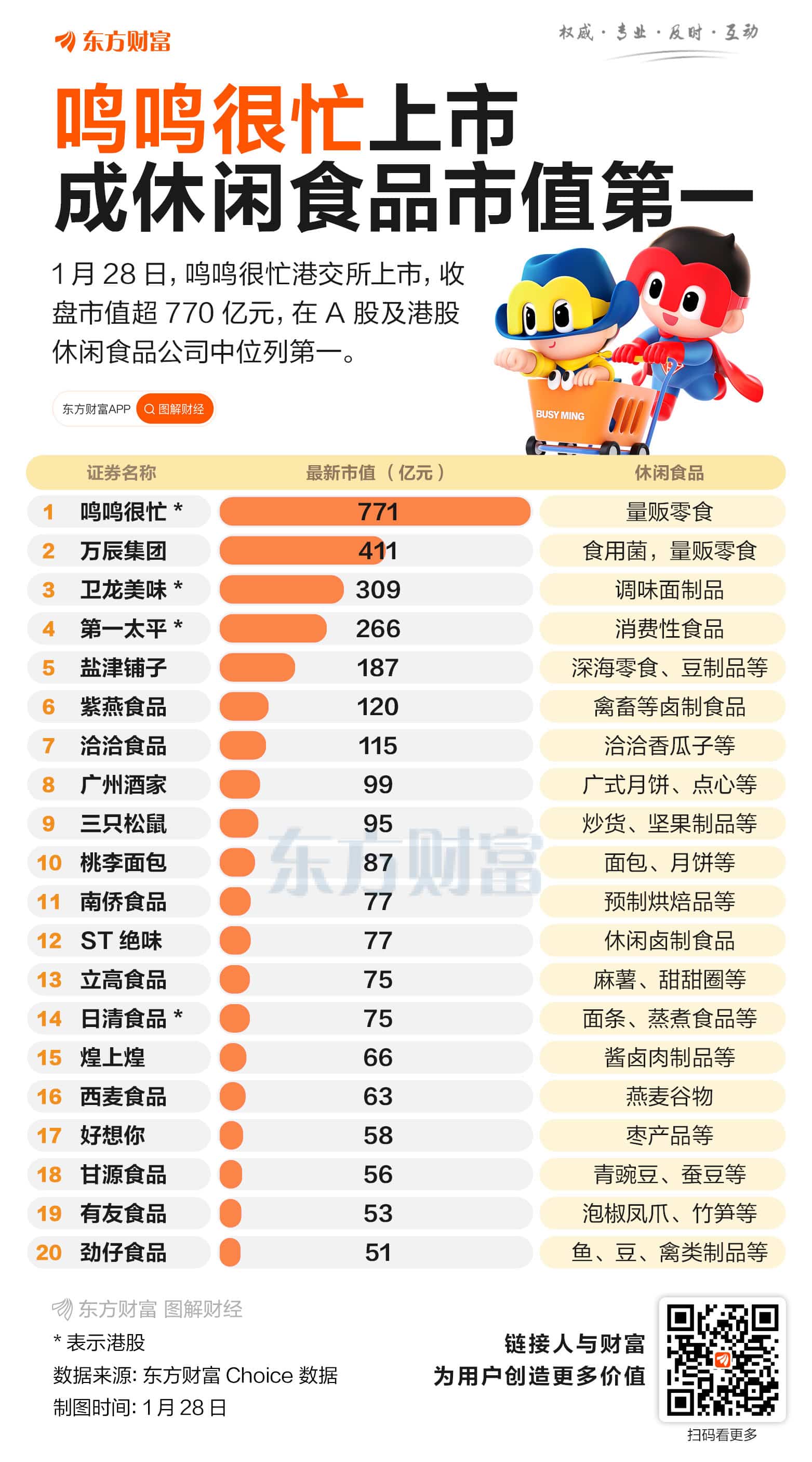 据东方财富Chocie 数据,截至 1 月 28 日,加上鸣鸣很忙在内,A 股及港股申万休闲食品行业上市公司共计 28 股,鸣鸣很忙最新市值 771 亿元,在其中位列第一,远超第二名万辰集团(411 亿元)。港股公司卫龙美味和第一太平分别位列第三、第四,市值均超 200 亿元。