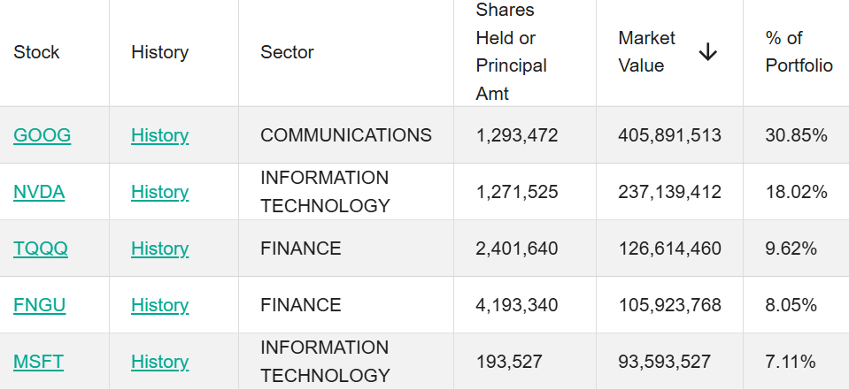 截至 2025 年底,东方港湾海外基金共持有 10 只标的,前五大重仓分别为:谷歌、英伟达、TQQQ(3 倍做多纳斯达克100ETF)、FNGU、微软。