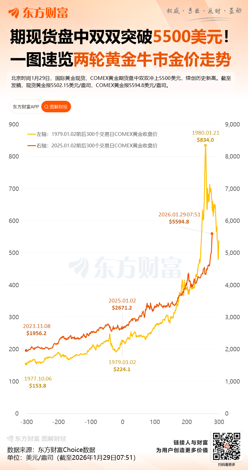 1 月 29 日开盘,国际黄金价格继续大涨,黄金现货价格一度逼近 5600 美元每盎司,但随后快速跳水。截至发稿,跌破 5500 美元每盎司。