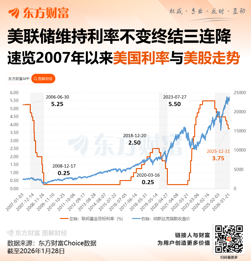 北京时间周四 (1 月 29 日) 凌晨,美联储结束为期两天的货币政策会议,宣布将联邦基金利率目标区间维持在 3.5% 至 3.75% 之间,符合市场普遍预期。