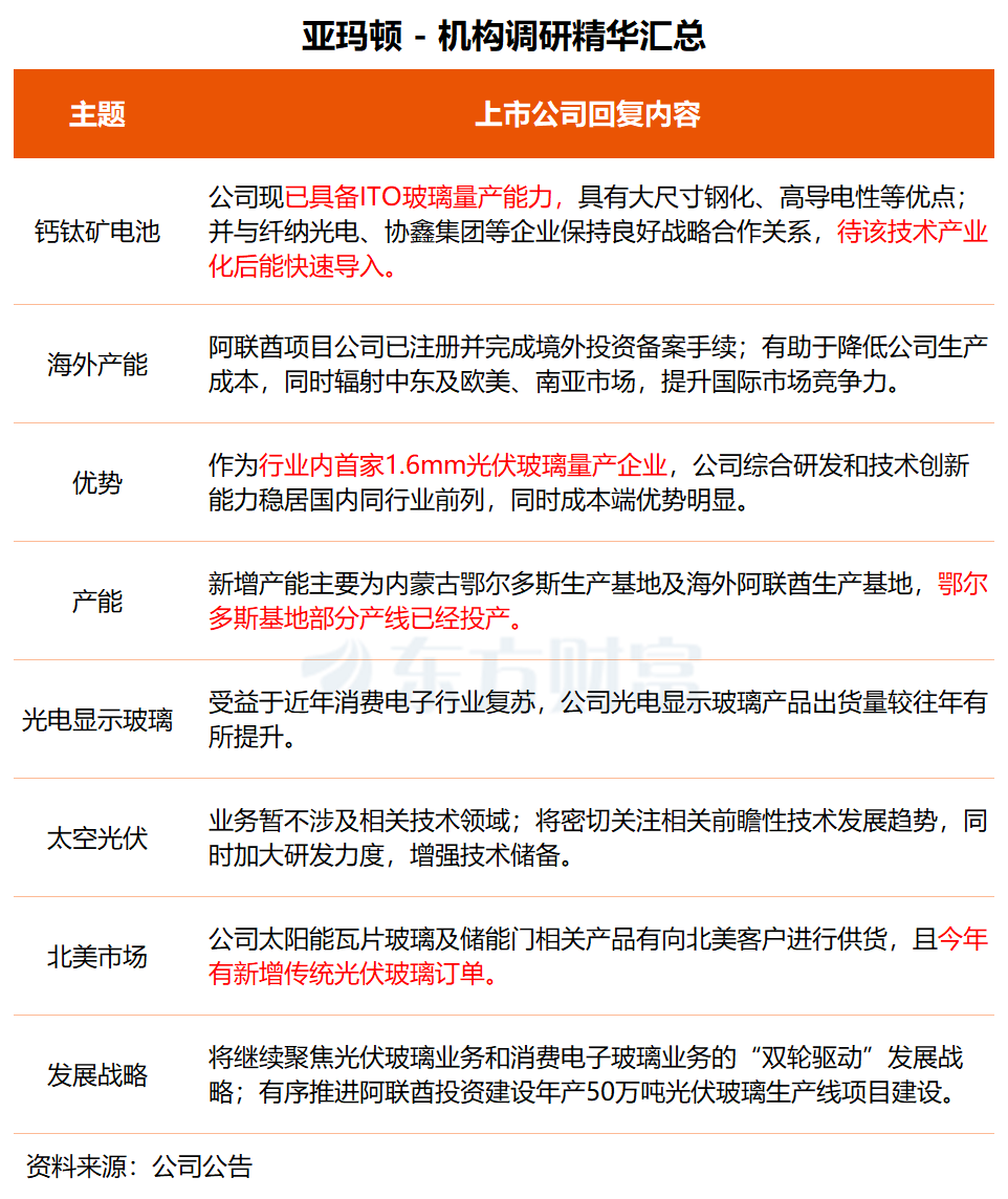 亚玛顿昨日接受联储证券、银华基金等近 20 家机构调研。公司在调研中表示,公司太阳能瓦片玻璃及储能门相关产品有向北美客户进行供货,且今年有新增传统光伏玻璃订单。