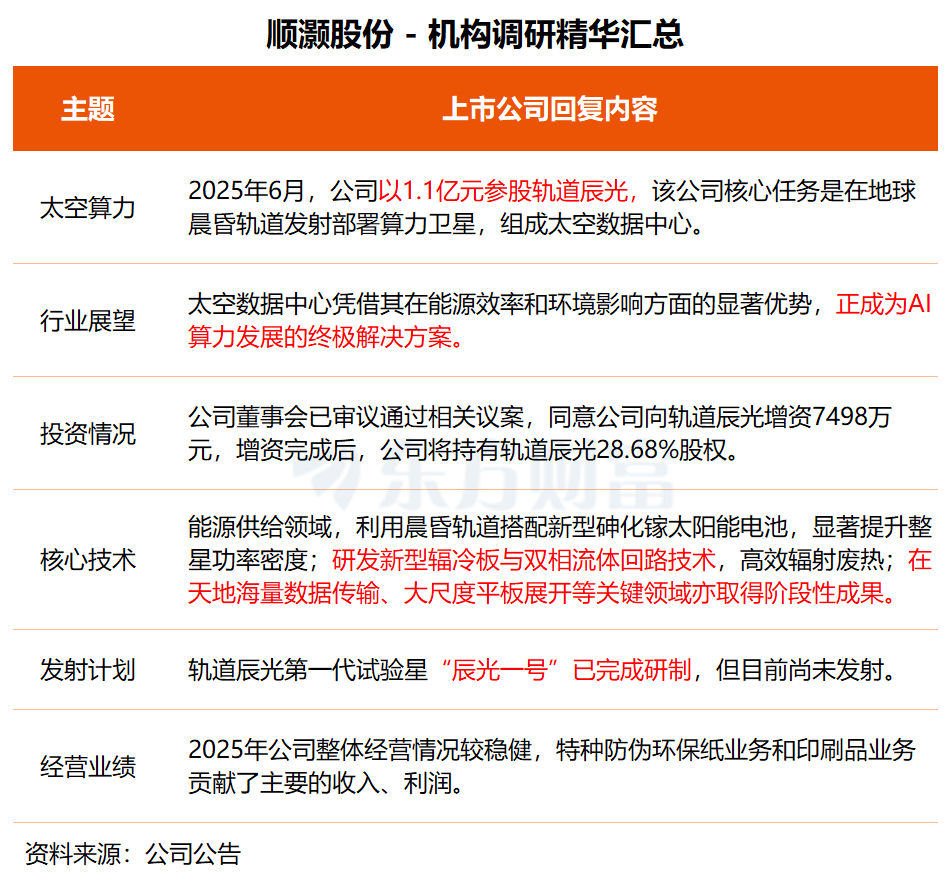 去年 6 月,顺灏股份以 1.1 亿元参股主营太空数据中心的轨道辰光,持股比例为 19.30%;公司近日审议通过相关议案,拟向轨道辰光进一步增资约 7498 万元,持股比例将升至 28.68%。
