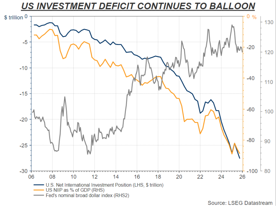 在大选年,美国政府若试图推动美元贬值,最核心的担忧在于:此举可能影响海外投资者持有规模庞大的美国资产的稳定性。截至去年底,海外投资者持有的美国资产规模已超 27 万亿美元,且仍在持续增长。
