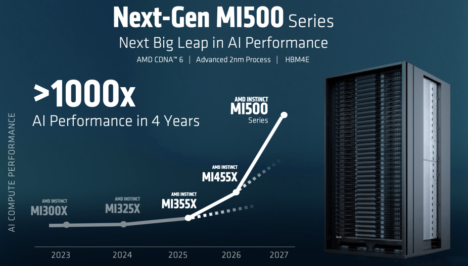 CES 2026 大会上,AMD 首席执行官苏姿丰宣布,公司新一代 AI 芯片 MI455X 已迈入 2nm 工艺时代,单颗芯片晶体管数量达 3200 亿颗。并预计于 2027 年发布 MI500 系列,还承诺在 4 年 (2023-2027 年) 内实现 1000 倍的 AI 性能提升。