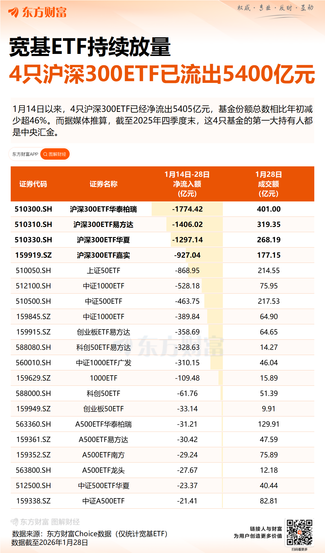 Wind 数据显示,1 月 28 日,华泰柏瑞基金、易方达基金、华夏基金、嘉实基金旗下沪深 300ETF 合计净流出超 970 亿元,今年以来合计净流出超 5400 亿元,基金份额总数相比年初减少超 46%。