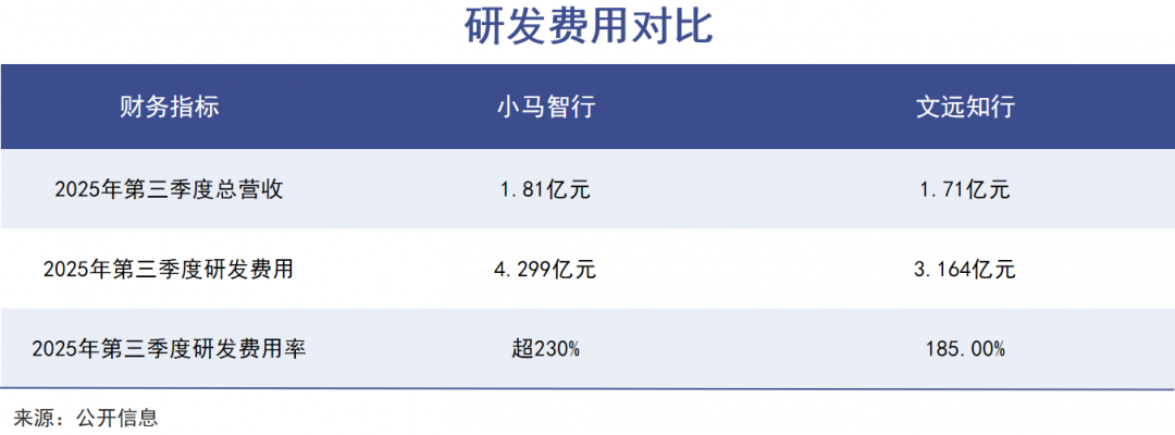 从财务数据看,两家公司都面临 「增收不增利」 的行业通病。2025 年第三季度,小马智行营收 1.81 亿元,同比增长 72%;文远知行营收 1.71 亿元,同比激增 144.3%。然而营收增长亮眼的背后,是亏损持续扩大:小马智行当季净亏损 4.38 亿元,文远知行净亏损 3.07 亿元。