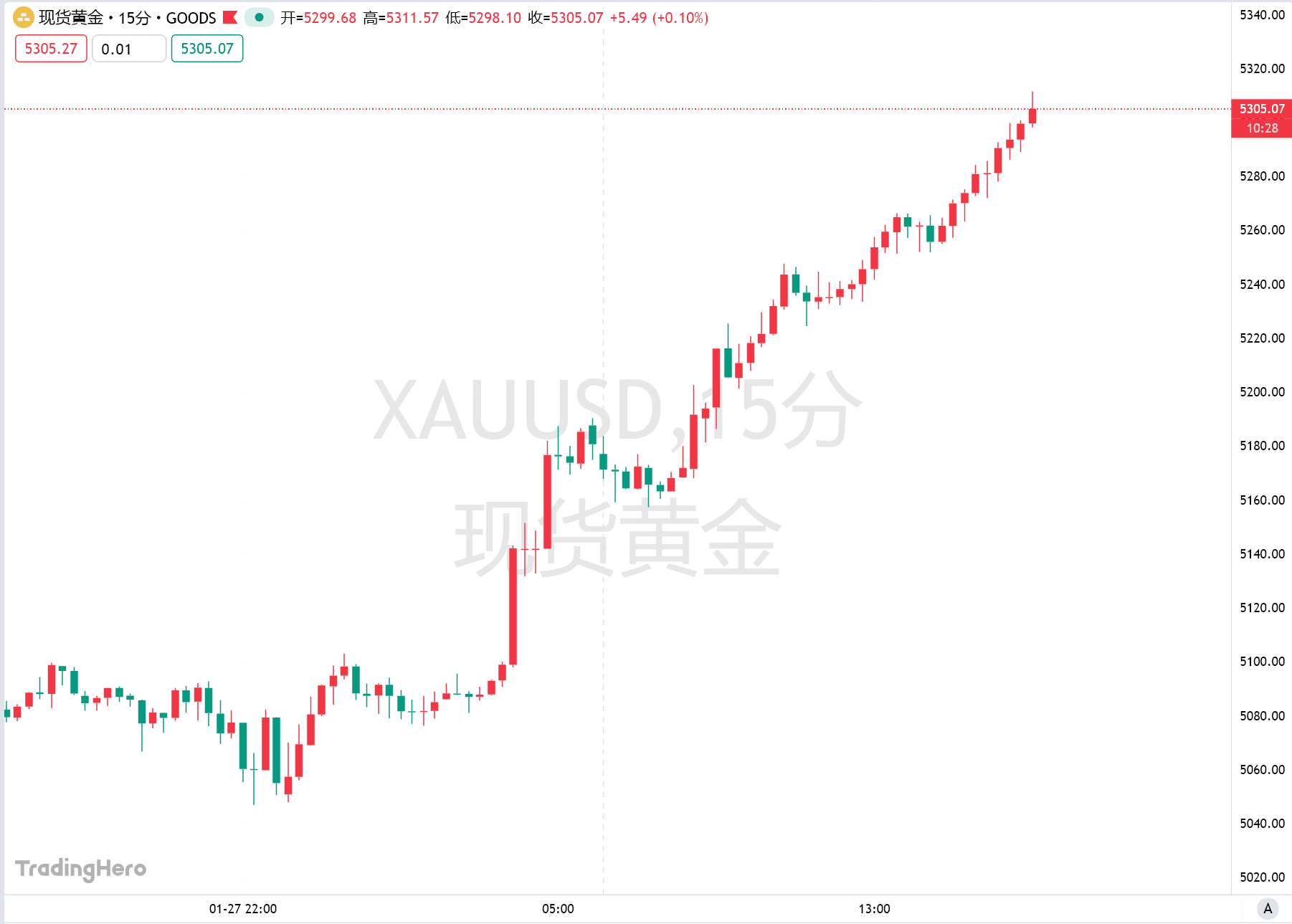周三,国际现货黄金价格一路上扬,首次突破 5300 美元/盎司,周内已连破四个整百关口,本周累计涨超 300 美元,截至发稿又向上触及 5310 美元/盎司,日内涨超 2.5%。