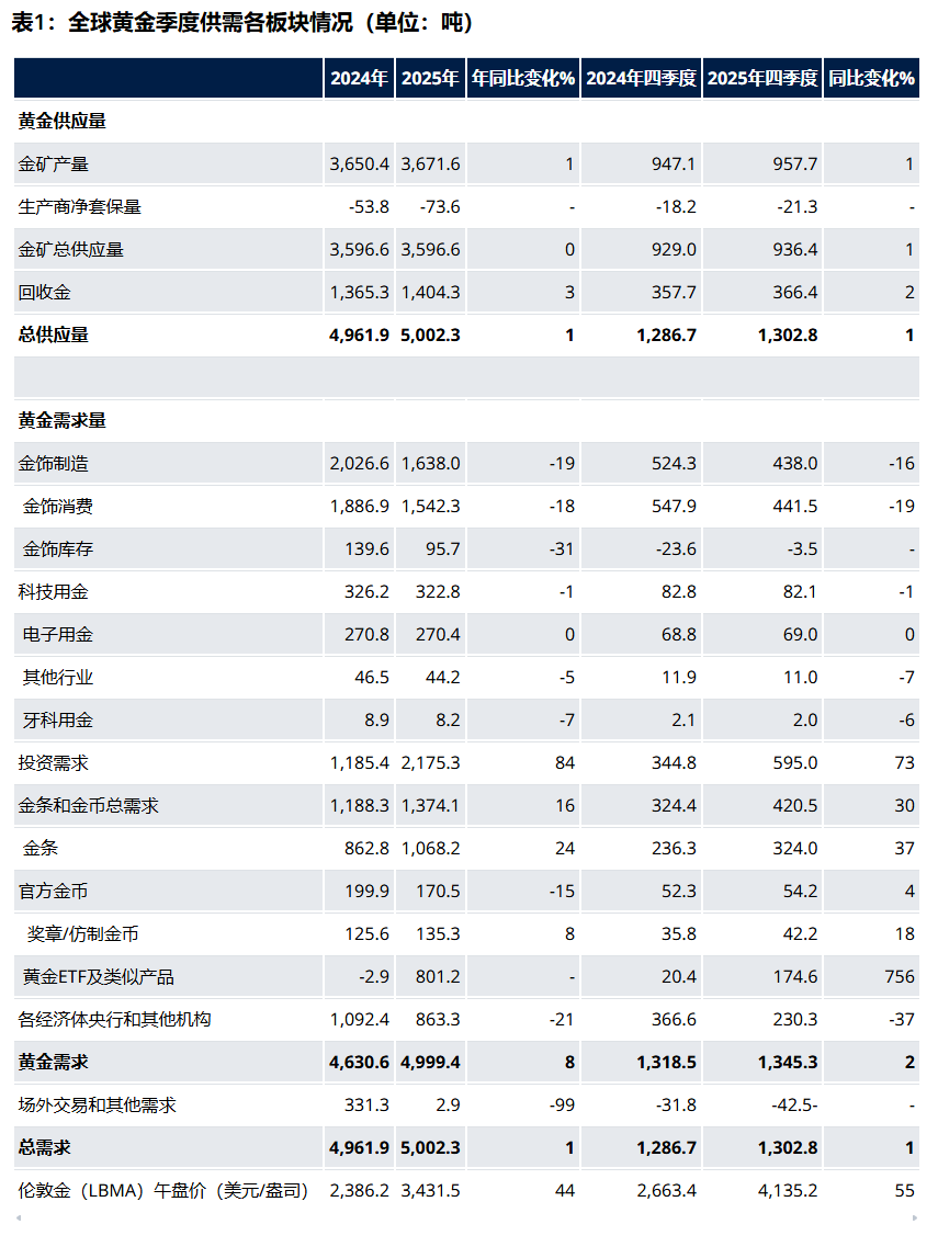 2025 年见证了全球黄金需求的激增和金价的大幅飙升。持续的经济和地缘政治风险已成为 『新常态』,消费者和投资者纷纷买入并持有黄金。黄金投资需求成为全年焦点,投资者通过各种可用渠道争相配置黄金,而其他细分领域也对全球黄金需求发挥了支撑作用。美元金价较上年同比大涨 67%,但金饰需求仅下降 18%,说明消费者在高金价环境下仍愿意购入金饰产品;同时,全球央行也坚定致力于增加黄金储备。