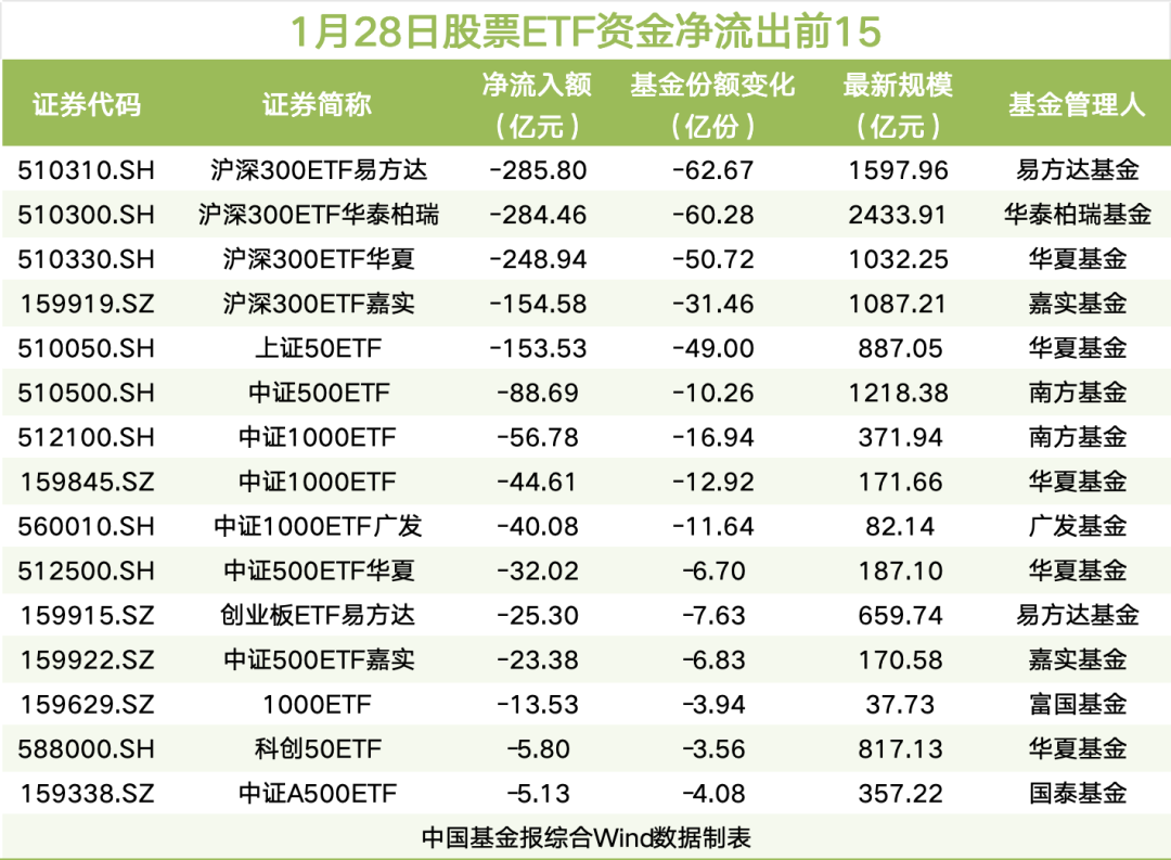 1 月 28 日,宽基 ETF 资金净流出居前,达 1471.86 亿元,其中,沪深 300 指数产品资金净流出达 975.3 亿元。